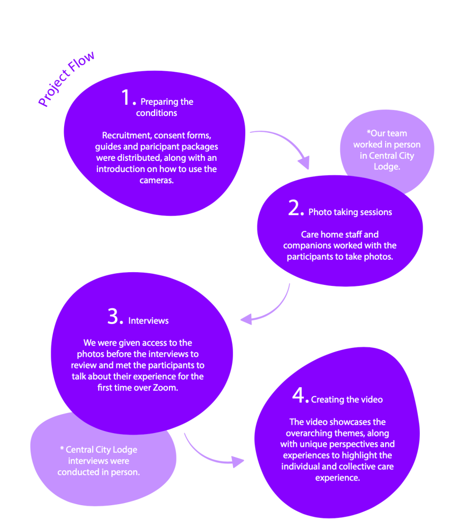 After conducting the interviews, our team decided to focus on understanding and representing the collective care experience. We identified similarities and differences between the participating care homes, leading to 6 key themes. Many contrasting experiences were shared during the interviews. We typically saw similarities and themes within each care home, with noticeable discrepancies between the four participating care homes. After conducting the interviews, our team decided to focus on understanding and representing the collective care experience. We identified similarities and differences between the participating care homes, leading to 6 key themes. Many contrasting experiences were shared during the interviews. We typically saw similarities and themes within each care home, with noticeable discrepancies between the four participating care homes.